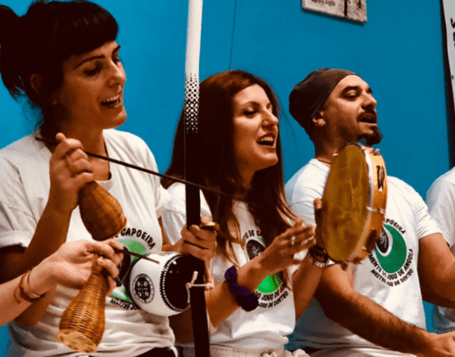 La Capoeira nasce dalla tradizione afro-brasiliana, laddove il canto è una consuetudine sociale irrinunciabile all’interno della comunità. I racconti narrati nelle canzoni rappresentano il mezzo privilegiato per condividere conoscenze e tradizioni. Attraverso la musica ed il ritmo, ogni partecipante mette a disposizione di tutti i presenti la propria energia in una sorta di “microcosmo” che diventa metafora del mondo che ci circonda. Questo legame con un passato lontano, dunque, risuona ancora oggi attraverso i ritmi del Berimbau, lo strumento più importante della “batteria di Capoeira” il quale, come un maestro sapiente, è capace di guidare i passi di ogni capoerista, dal più giovane al più esperto, per superare le difficoltà senza mai perdere fiducia in se stessi. Conoscere e padroneggiare il significato dei canti ed imparare a suonare gli strumenti principali, contribuirà a renderci protagonisti attivi del gioco anche “dietro le quinte”.